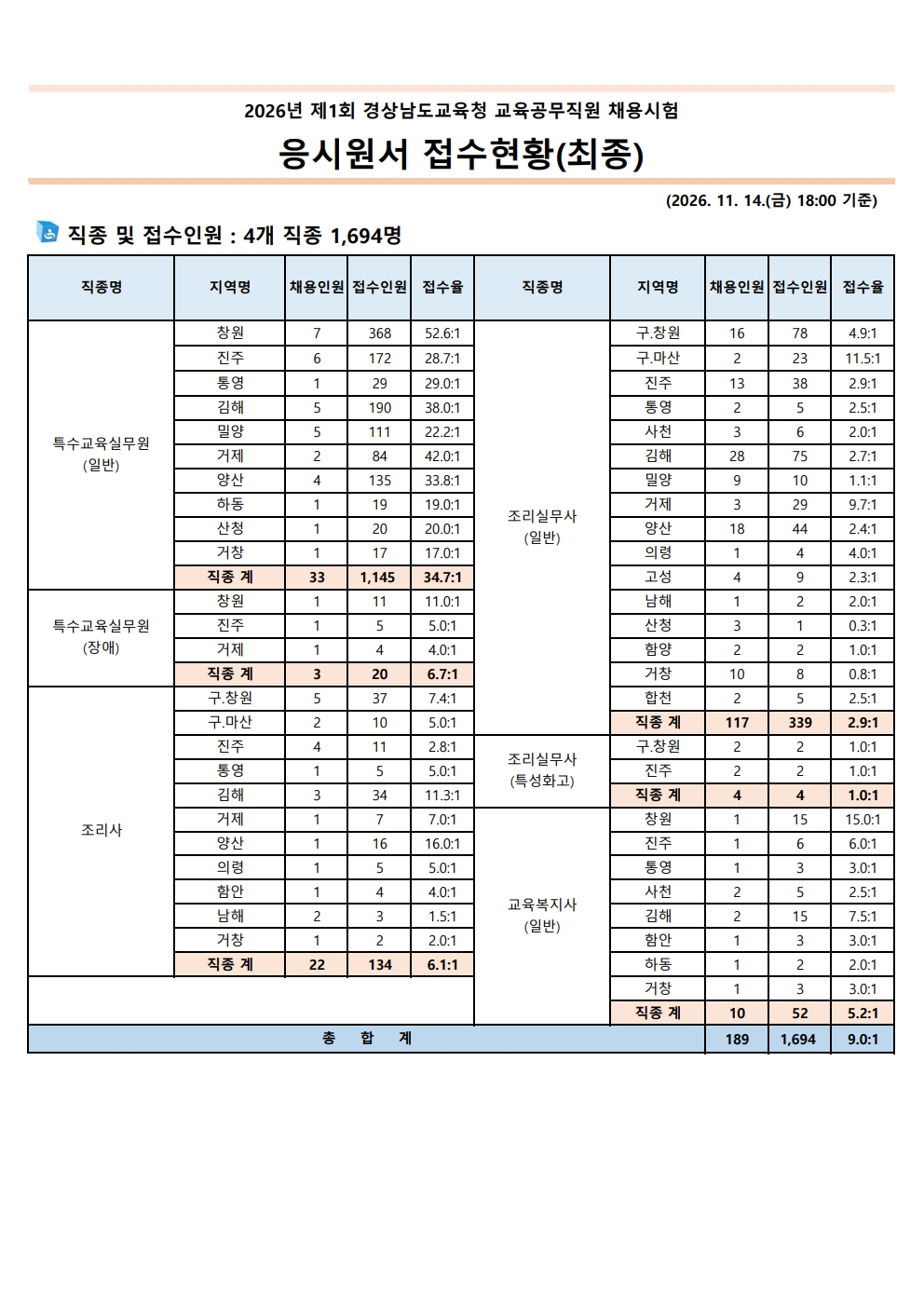 2026³â Á¦1ȸ °æ»ó³²µµ±³À°Ã» ±³À°°ø¹«Á÷¿ø ä¿ë½ÃÇè ÀÀ½Ã¿ø¼ Á¢¼öÇöȲ(ÃÖÁ¾)