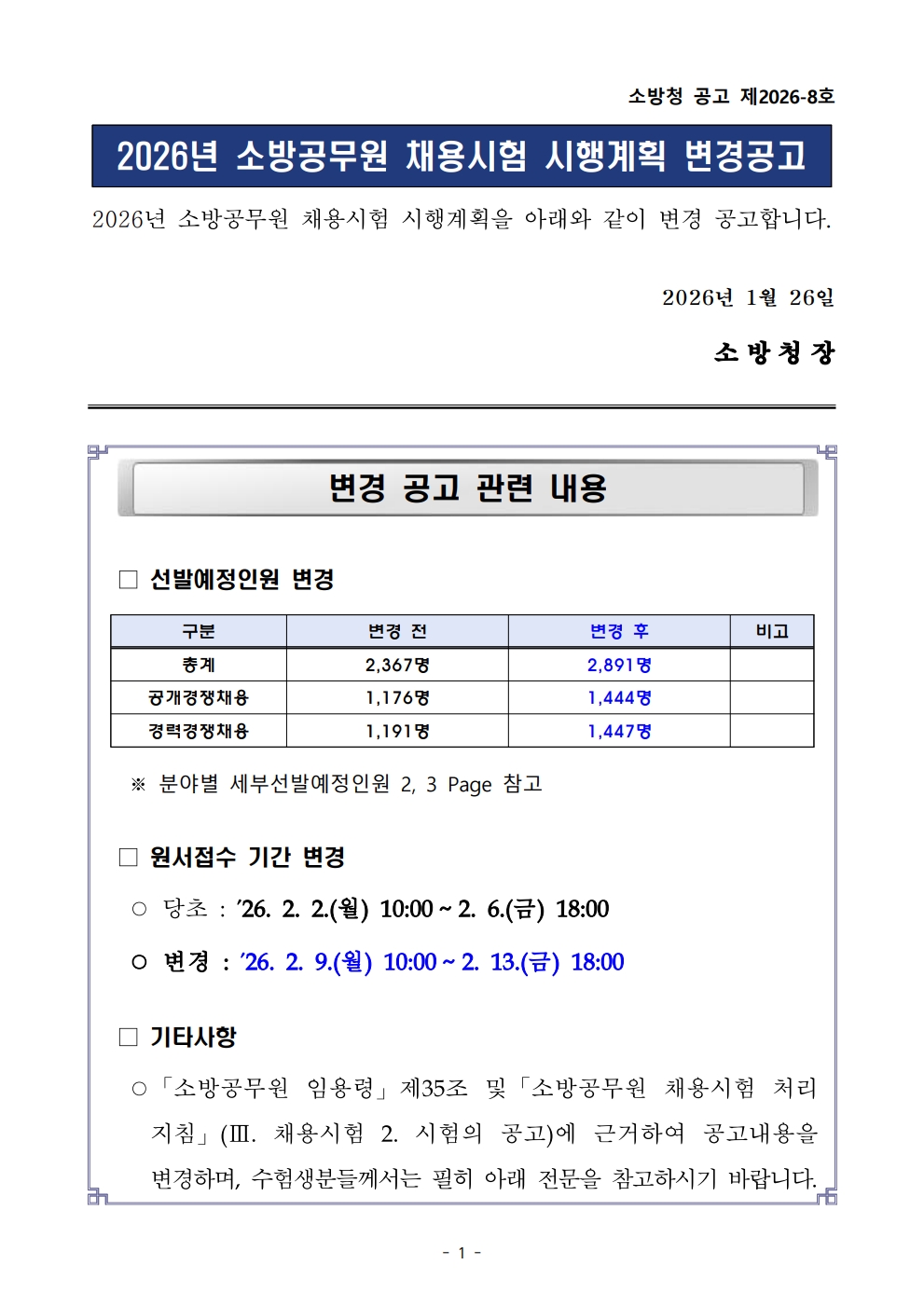 2026³â ¼Ò¹æ°ø¹«¿ø ä¿ë½ÃÇè ½ÃÇà°èȹ º¯°æ °ø°í (2,891¸í ä¿ë)