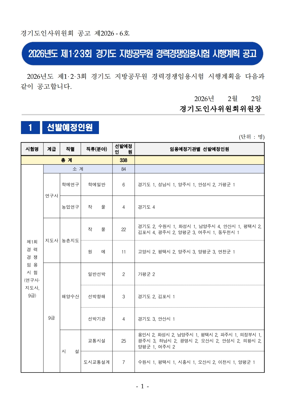 2026³âµµ Á¦1¡¤2¡¤3ȸ °æ±âµµ Áö¹æ°ø¹«¿ø °æ·Â°æÀïÀÓ¿ë½ÃÇè ½ÃÇà°èȹ °ø°í(338¸í ä¿ë)