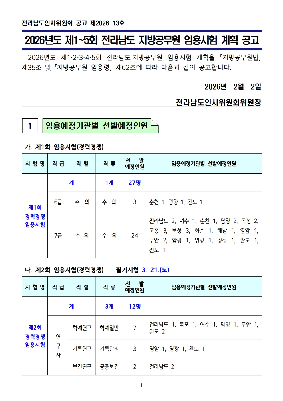 2026³âµµ Á¦1~5ȸ Àü¶ó³²µµ Áö¹æ°ø¹«¿ø ÀÓ¿ë½ÃÇè °èȹ °ø°í.pdf