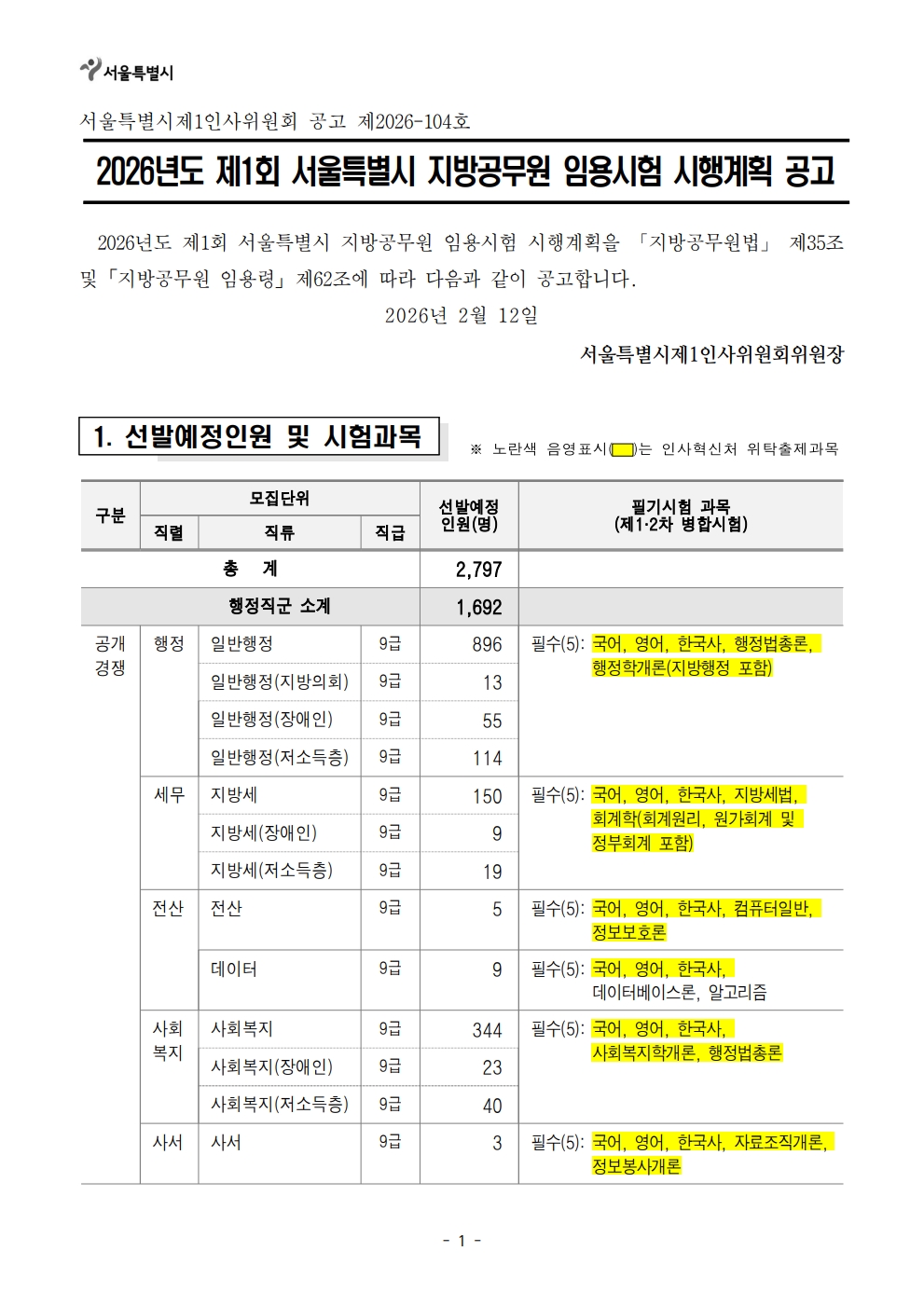 2026³âµµ Á¦1ȸ ¼¿ïƯº°½Ã Áö¹æ°ø¹«¿ø ÀÓ¿ë½ÃÇè ½ÃÇà°èȹ °ø°í (2,797¸í ä¿ë)