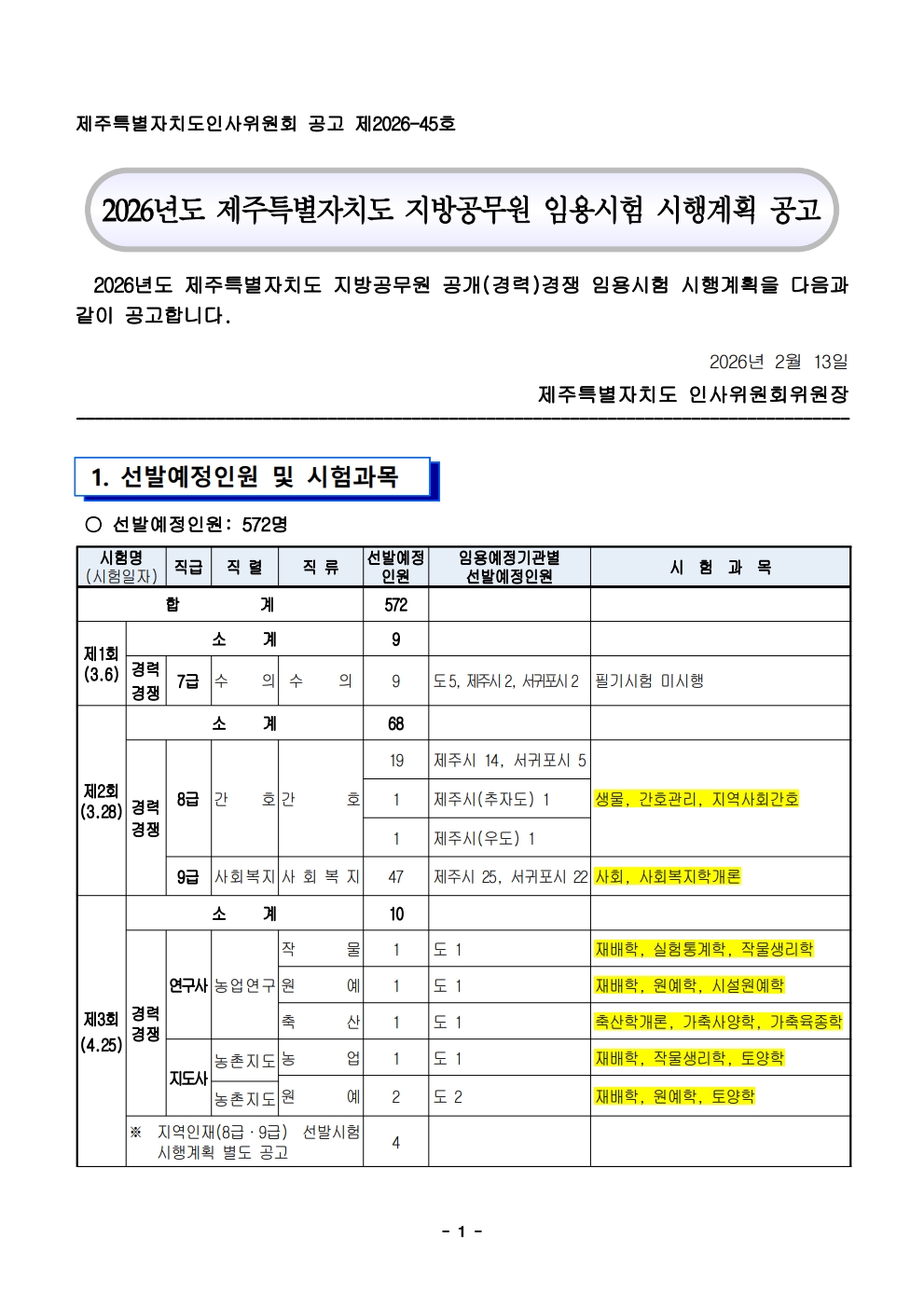 ¡Ú(2026-45È£) 2026³âµµ Á¦ÁÖÆ¯º°ÀÚÄ¡µµ Áö¹æ°ø¹«¿ø ÀÓ¿ë½ÃÇè ½ÃÇà°èȹ °ø°í_°Ô½Ã.pdf