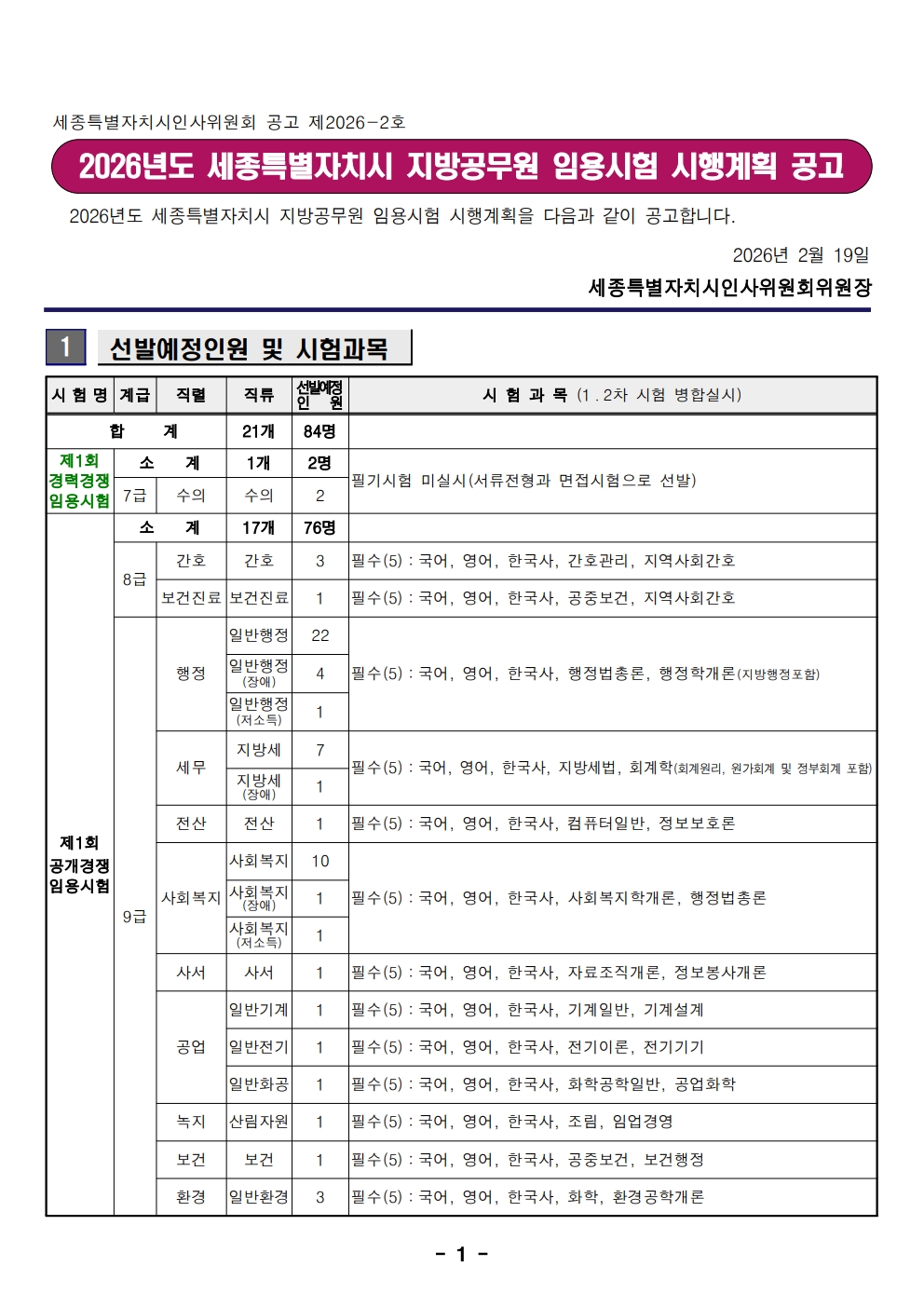 2026³âµµ ¼¼Á¾Æ¯º°ÀÚÄ¡½Ã Áö¹æ°ø¹«¿ø ÀÓ¿ë½ÃÇè ½ÃÇà°èȹ °ø°í (84¸í ä¿ë)