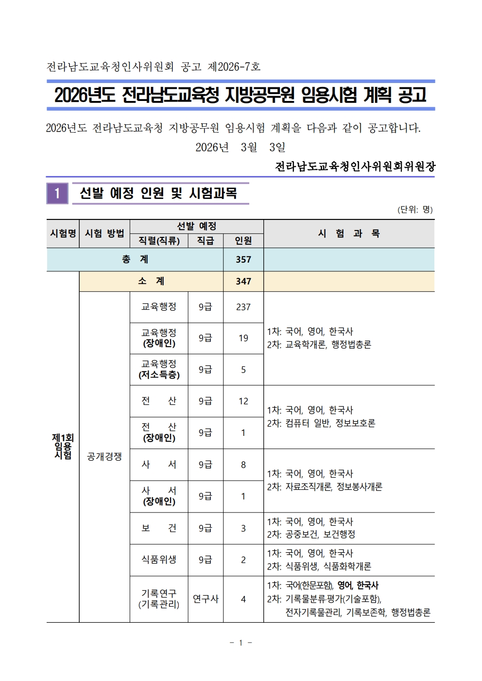 2026³âµµ Àü¶ó³²µµ±³À°Ã» Áö¹æ°ø¹«¿ø ÀÓ¿ë½ÃÇè ½ÃÇà°èȹ °ø°í (357¸í ä¿ë)