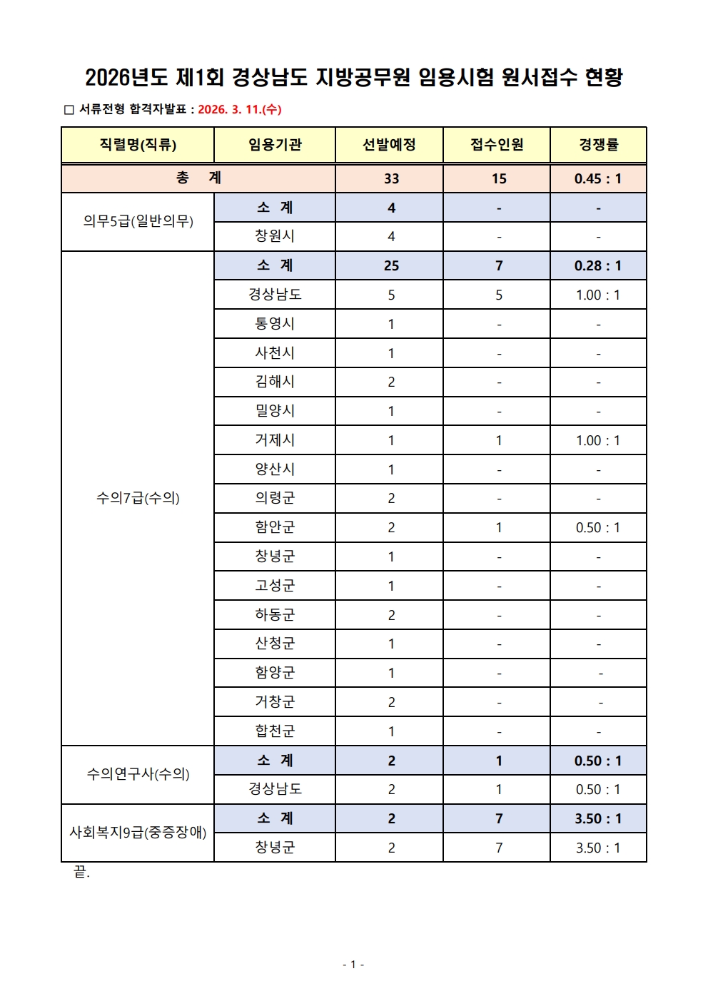 2026³âµµ Á¦1ȸ °æ»ó³²µµ Áö¹æ°ø¹«¿ø ÀÓ¿ë½ÃÇè ¿ø¼Á¢¼ö °á°ú¾È³»