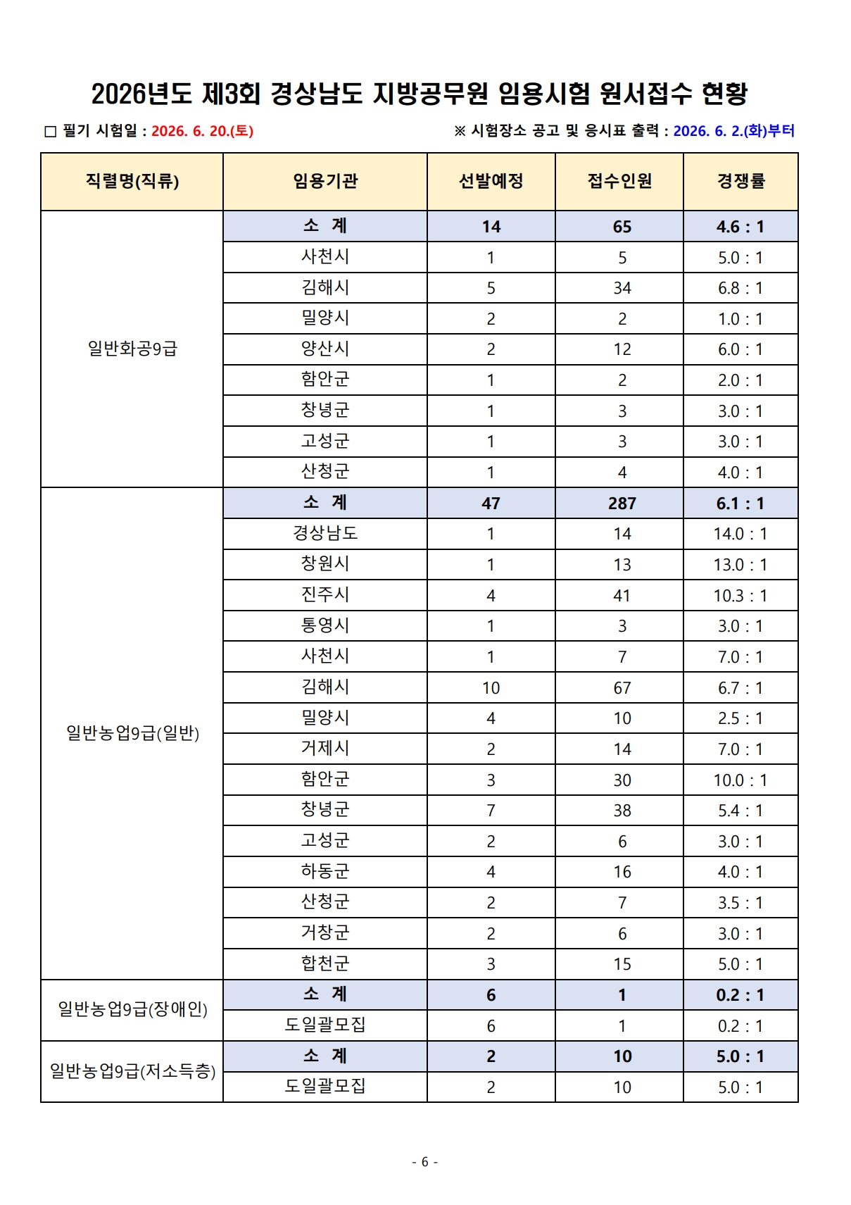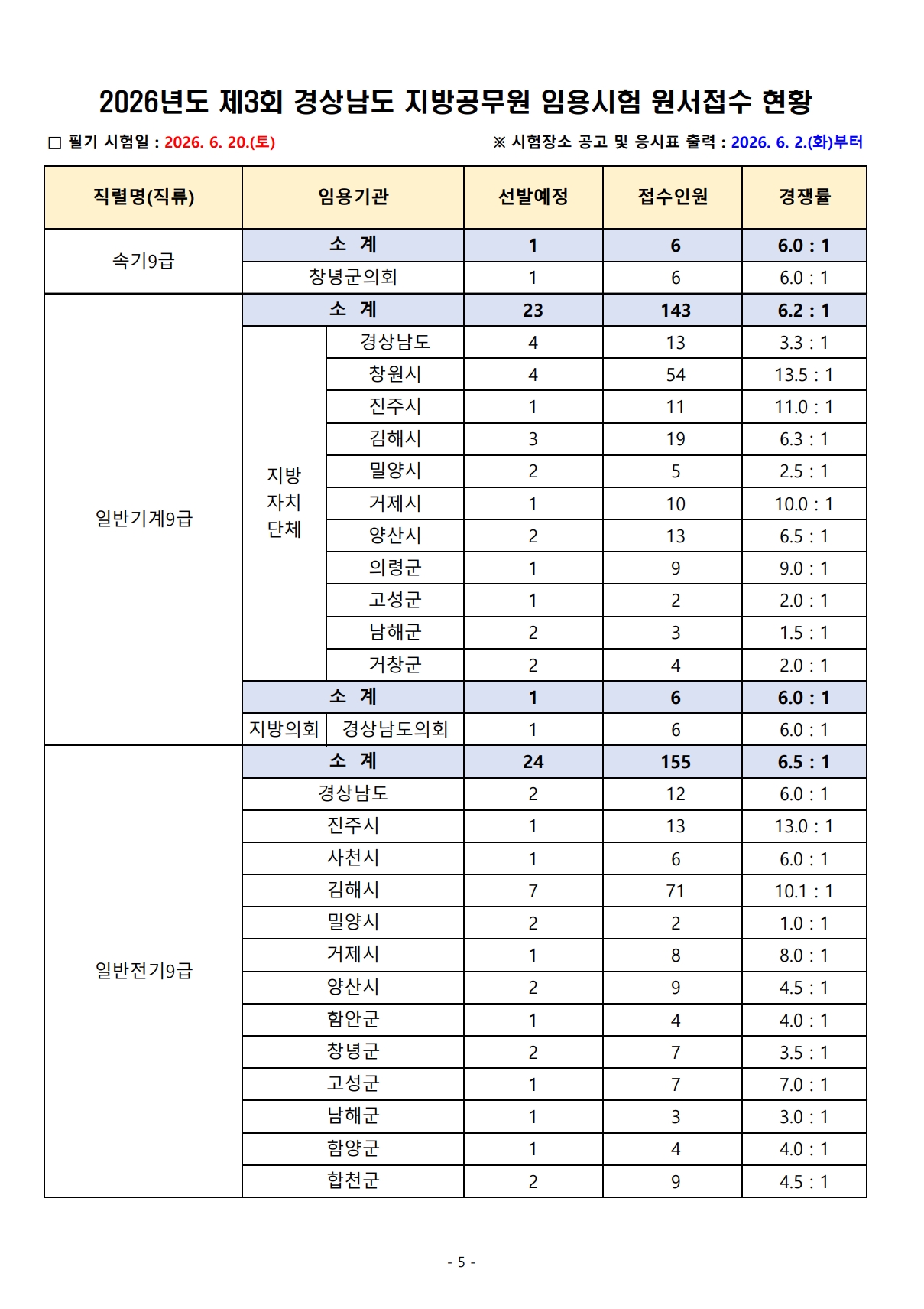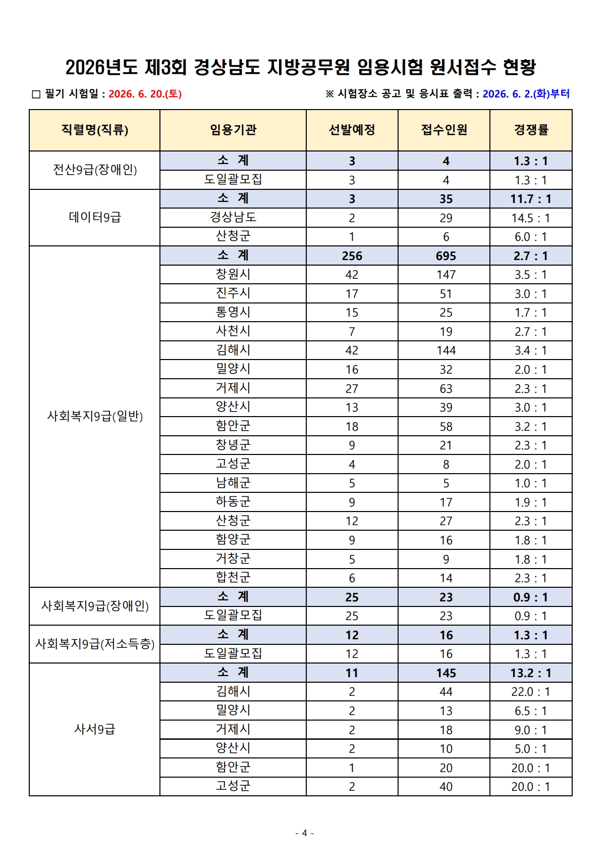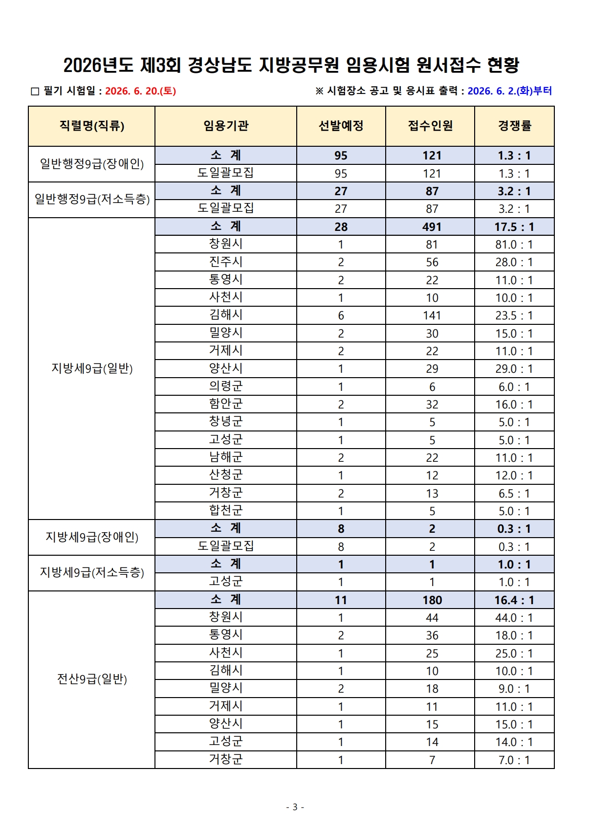2026³âµµ Á¦3ȸ °æ»ó³²µµ Áö¹æ°ø¹«¿ø ÀÓ¿ë½ÃÇè ¿ø¼Á¢¼ö °á°ú¾È³»