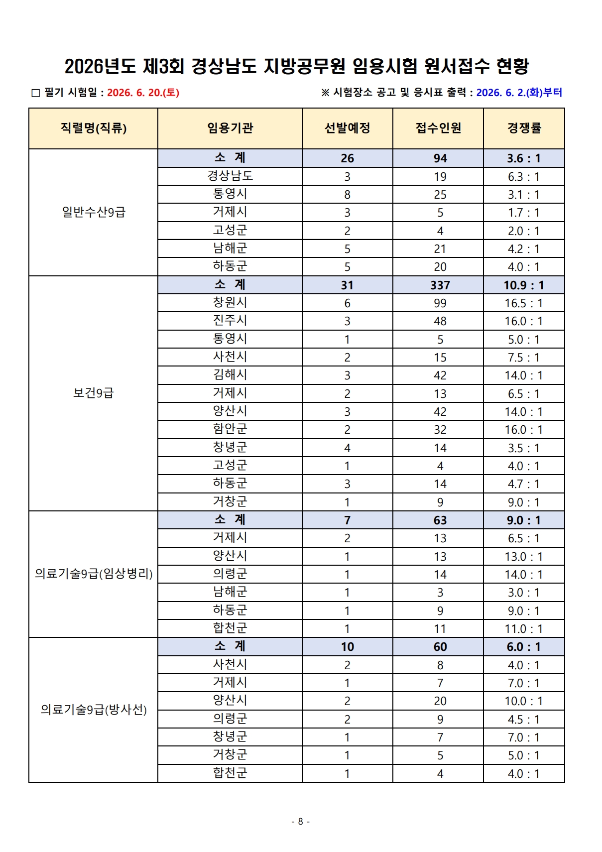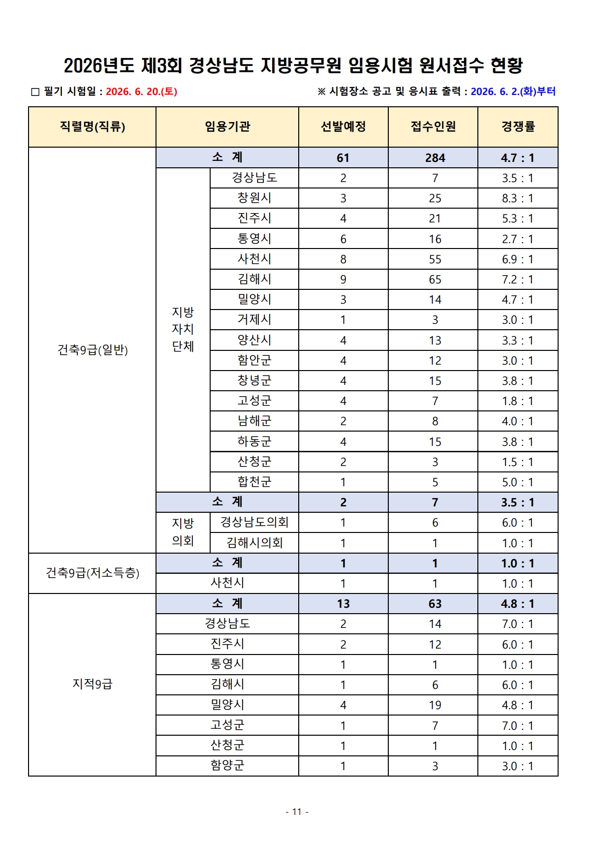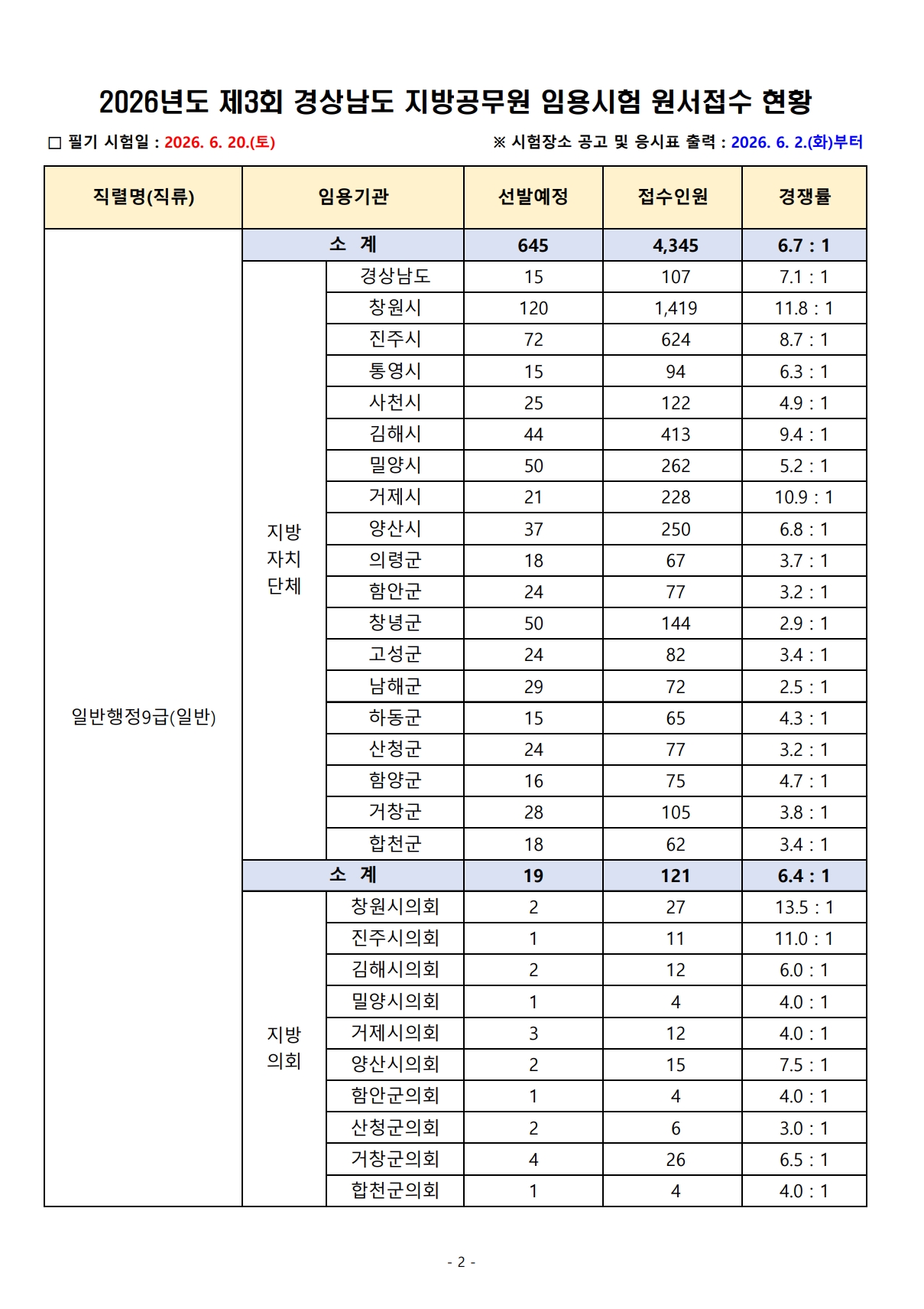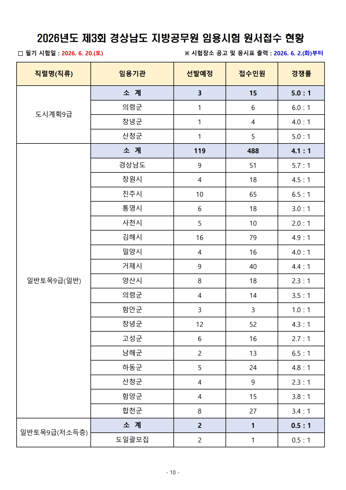 2026³âµµ Á¦3ȸ °æ»ó³²µµ Áö¹æ°ø¹«¿ø ÀÓ¿ë½ÃÇè ¿ø¼Á¢¼ö °á°ú¾È³»