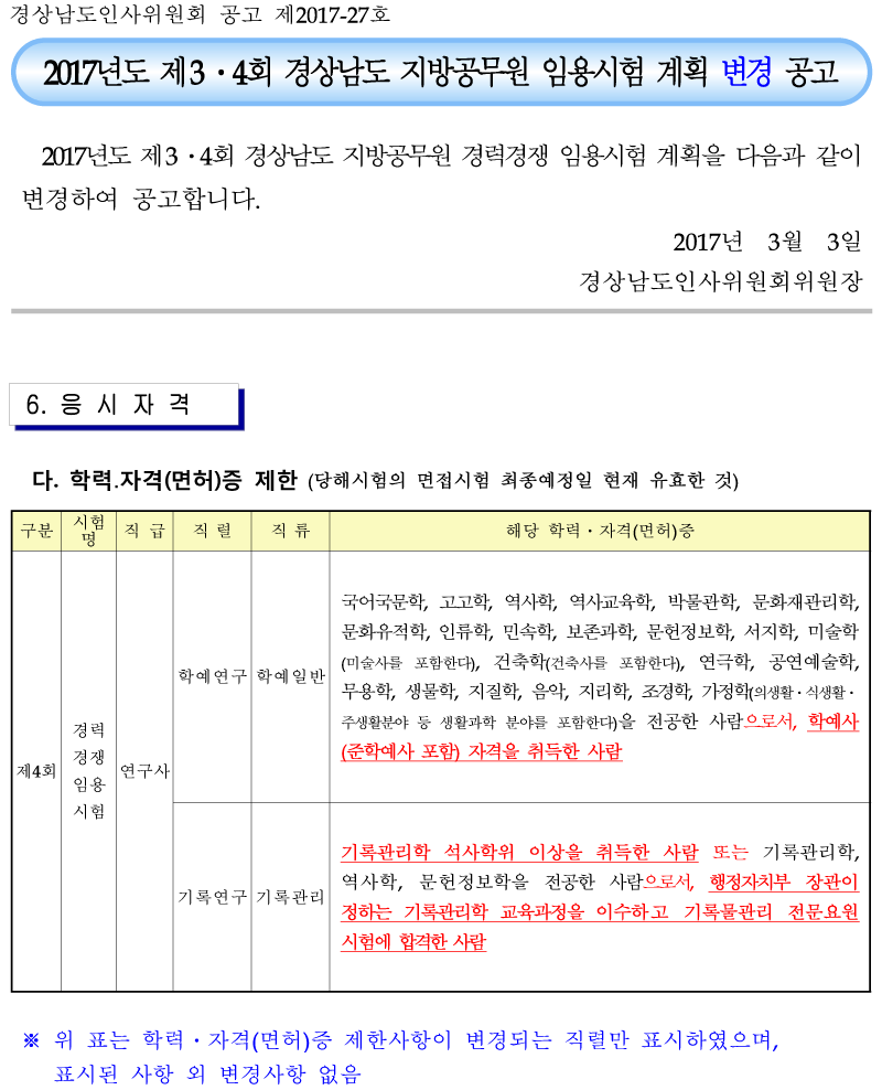 2017 Á¦3․4ȸ °æ³² Áö¹æÁ÷ ¿¬±¸»ç ÀÚ°ÝÁ¦ÇÑ º¯°æ