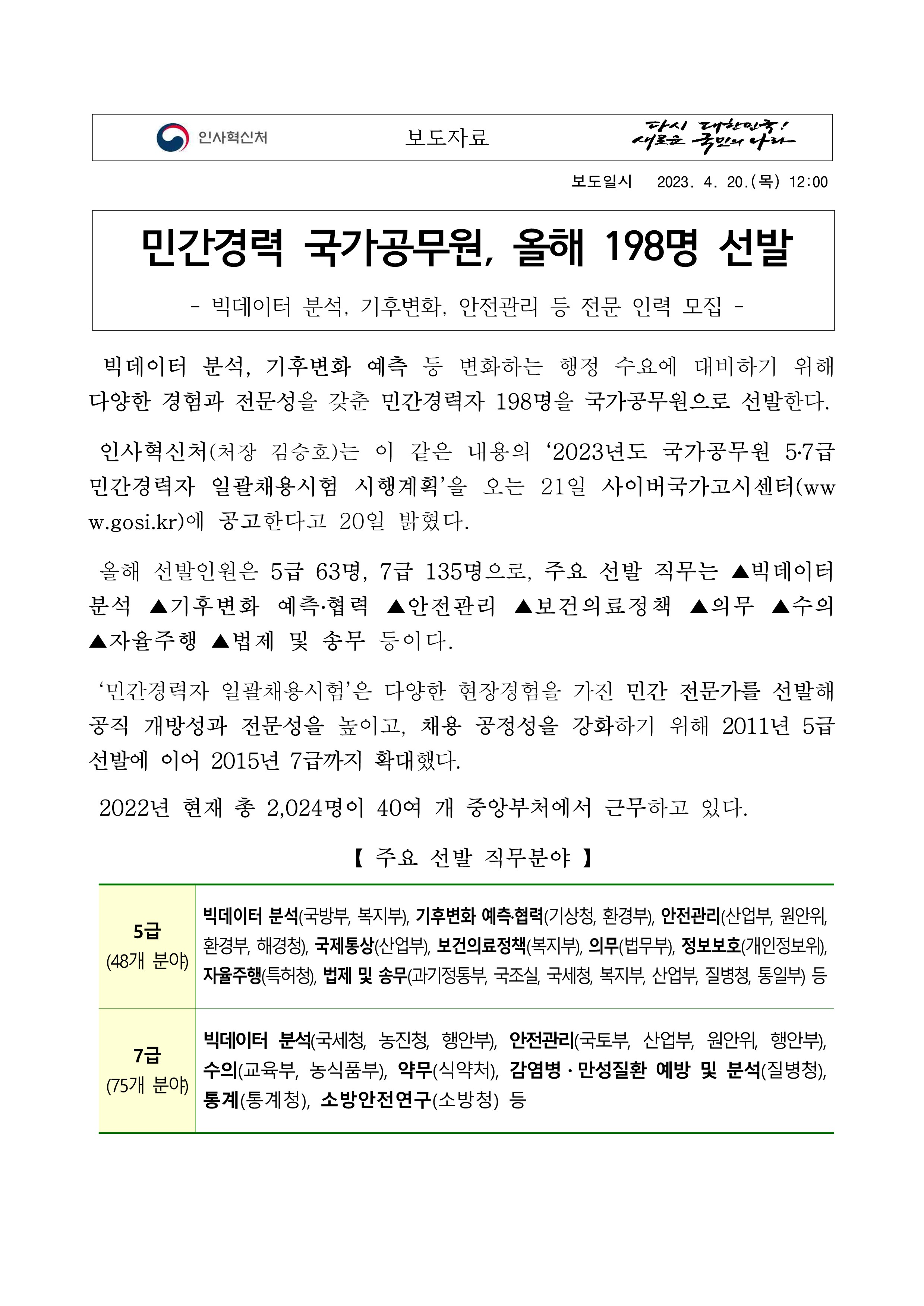 230421 (°æ·Âä¿ë°ú) ¹Î°£°æ·Â ±¹°¡°ø¹«¿ø, ¿ÃÇØ 198¸í ¼±¹ß.pdf