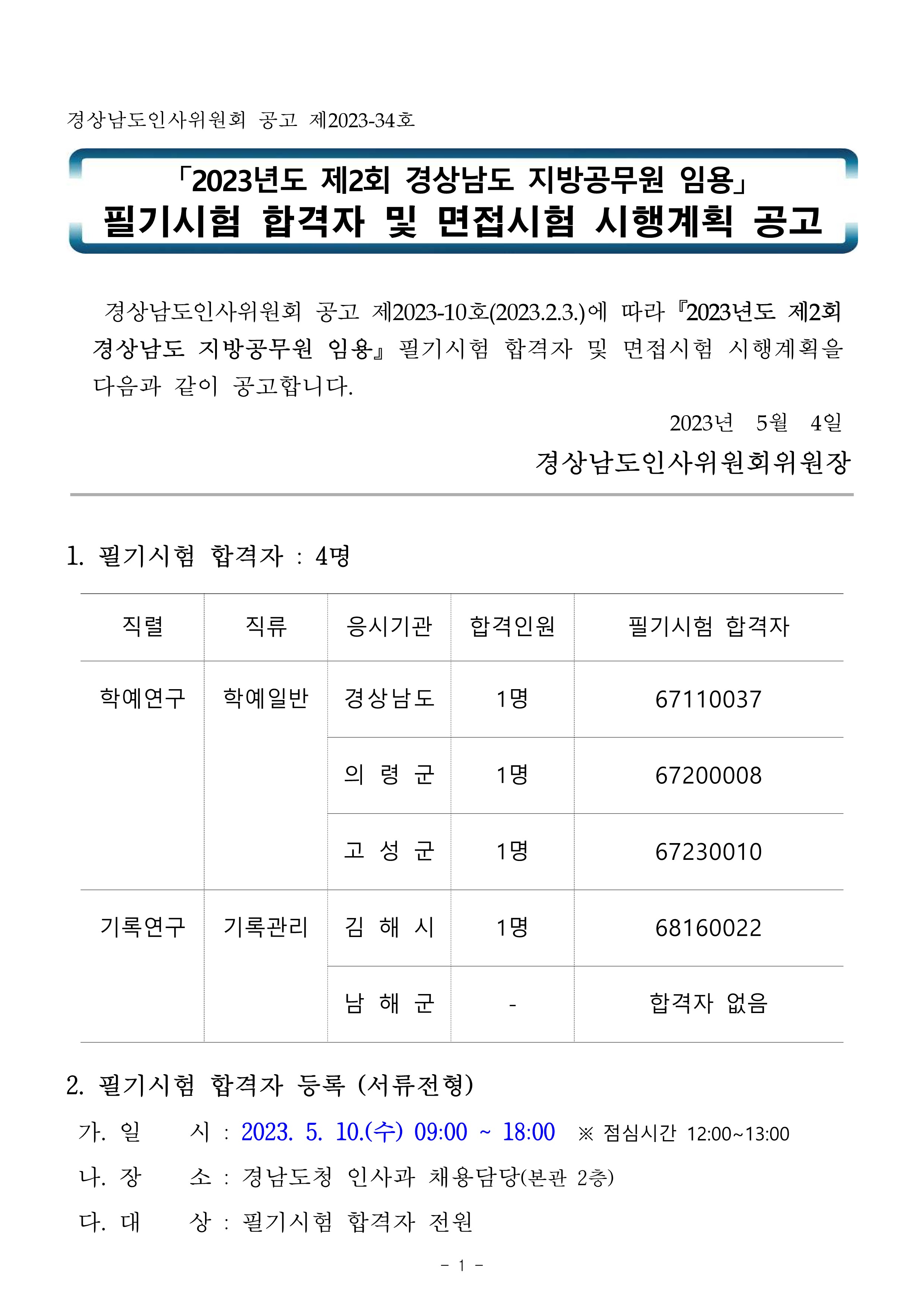 [°ø°í¹®]2023³âµµ Á¦2ȸ °æ»ó³²µµ Áö¹æ°ø¹«¿ø ÀÓ¿ë Çʱâ½ÃÇè ÇÕ°ÝÀÚ ¹ßÇ¥ ¹× ¸éÁ¢½ÃÇè ½ÃÇà°èȹ °ø°í.pdf