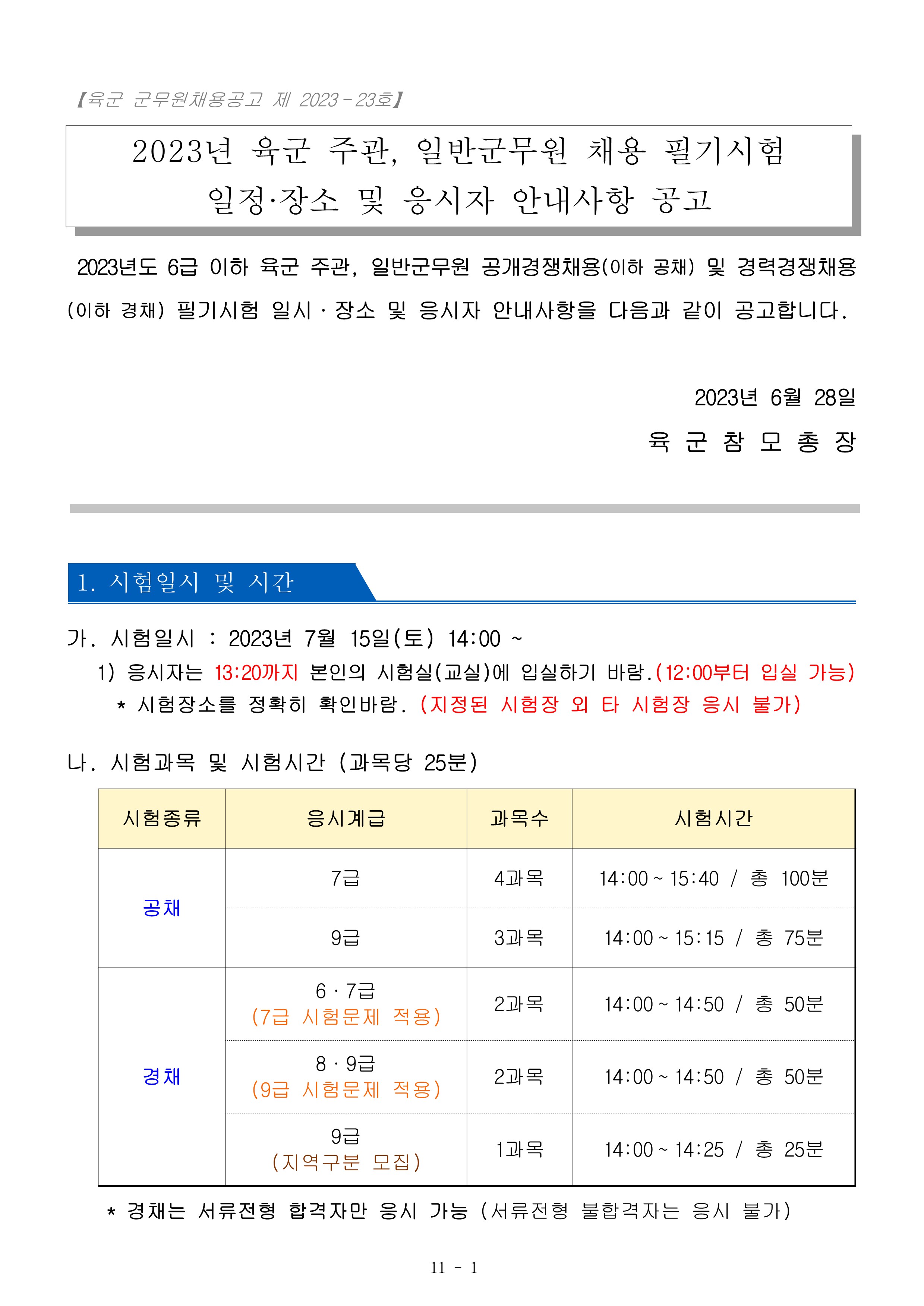 23³â À°±º ÁÖ°ü ÀϹݱº¹«¿ø ä¿ë Çʱâ½ÃÇè ÀϽÃ,Àå¼Ò ¹× ÀÀ½ÃÀÚ Áؼö»çÇ× °ø°í.pdf