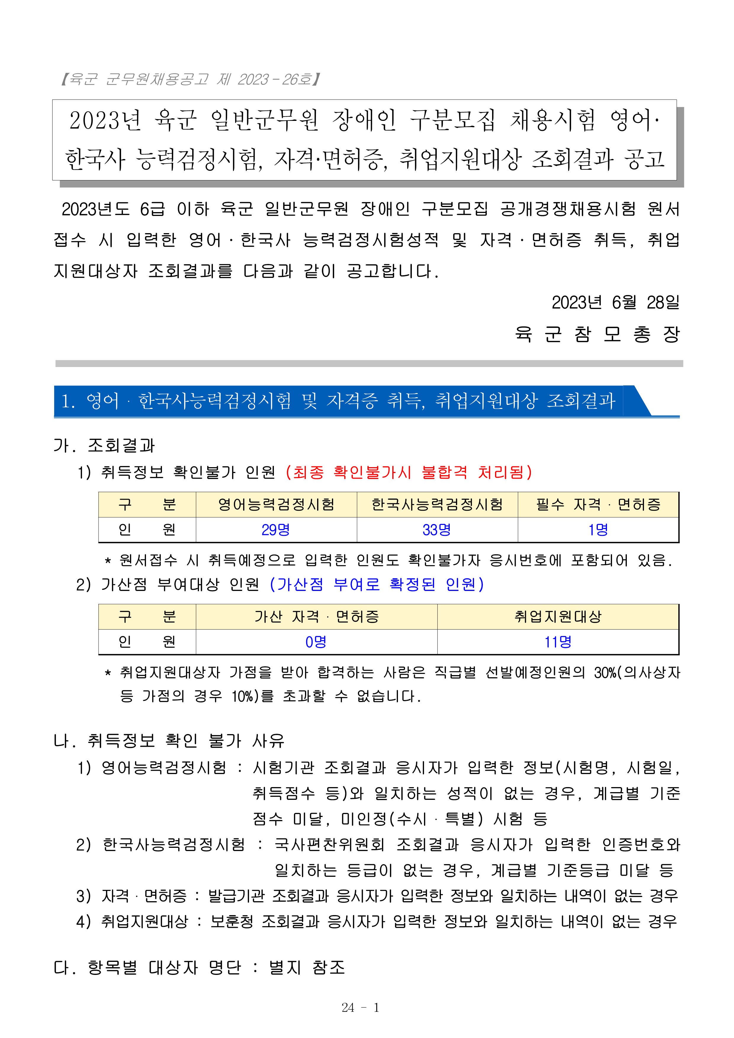 23³â À°±º ÀϹݱº¹«¿ø Àå¾ÖÀÎ ±¸ºÐ¸ðÁý ä¿ë½ÃÇè ¿µ¾î,Çѱ¹»ç,ÀÚ°Ý,¸éÇãÁõ, Ãë¾÷Áö¿ø´ë»ó Á¶È¸°á°ú °ø°í.pdf