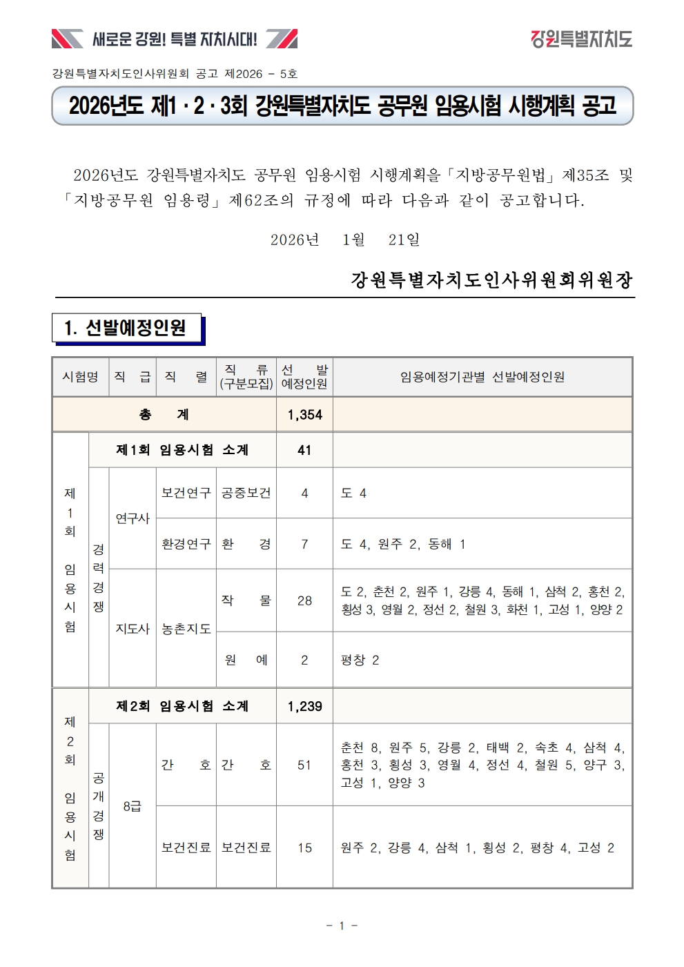 2026³âµµ Á¦1¡¤2¡¤3ȸ °¿øÆ¯º°ÀÚÄ¡µµ °ø¹«¿ø ÀÓ¿ë½ÃÇè ½ÃÇà°èȹ °ø°í (1,354¸í ä¿ë)
