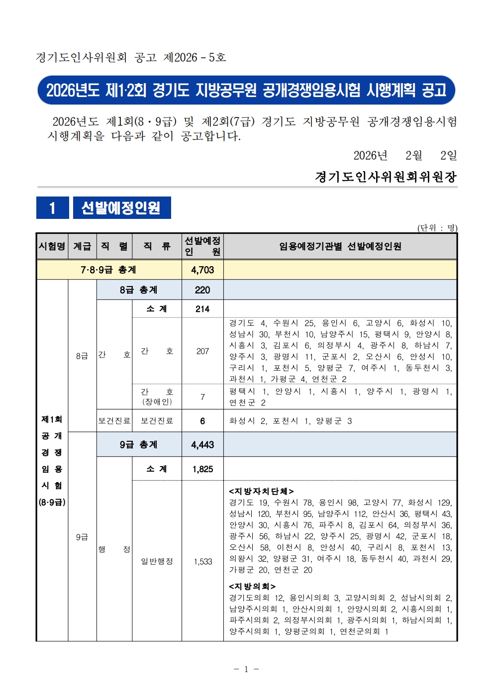 2026³âµµ Á¦1¡¤2ȸ °æ±âµµ Áö¹æ°ø¹«¿ø °ø°³°æÀïÀÓ¿ë½ÃÇè ½ÃÇà°èȹ °ø°í (4,703¸í ä¿ë)