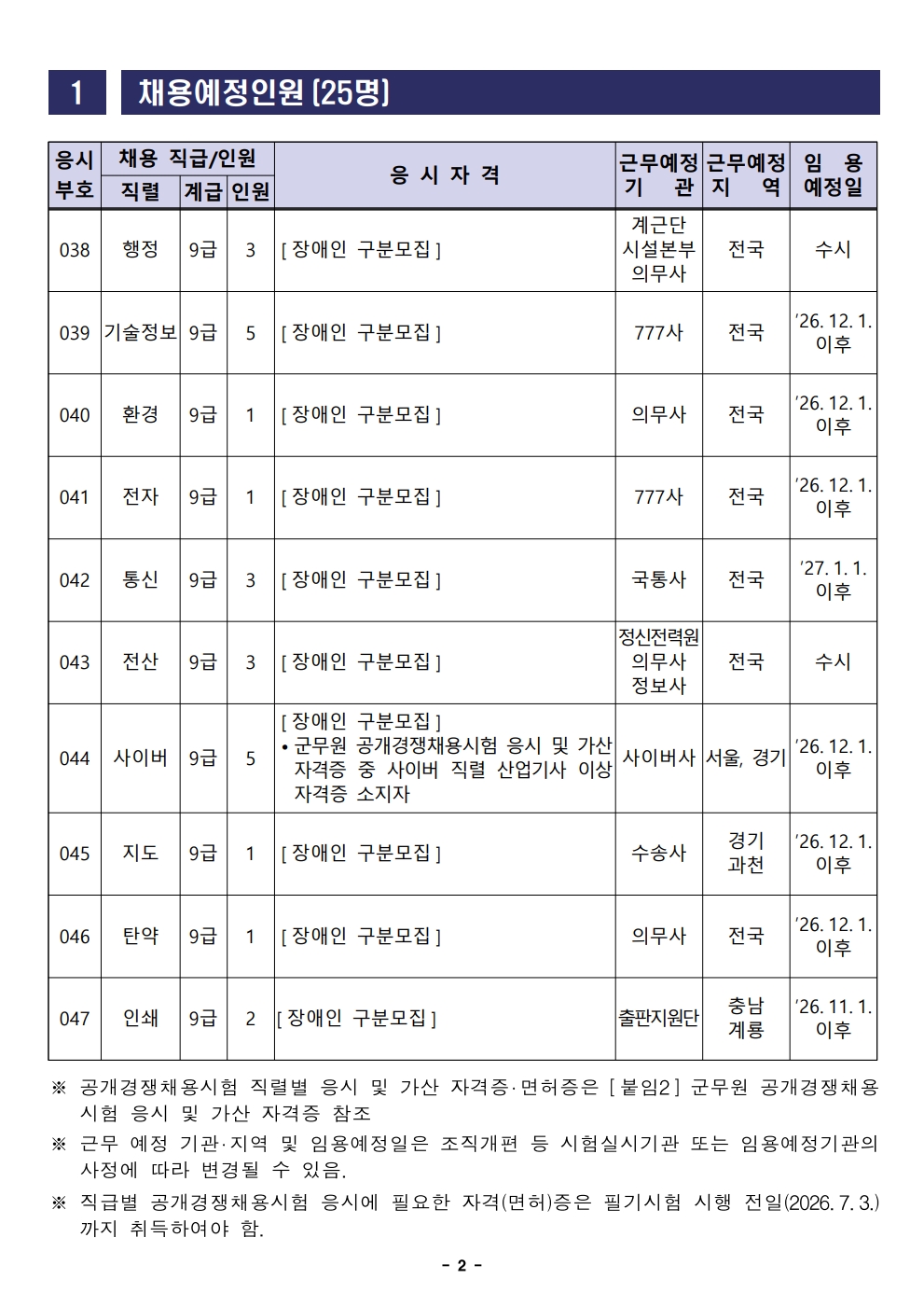 2026³âµµ ±¹¹æºÎ ÁÖ°ü ÀϹݱº¹«¿ø Àå¾ÖÀÎ ±¸ºÐ ¸ðÁý ä¿ë½ÃÇè ½ÃÇà°èȹ °ø°í(25¸í ä¿ë)