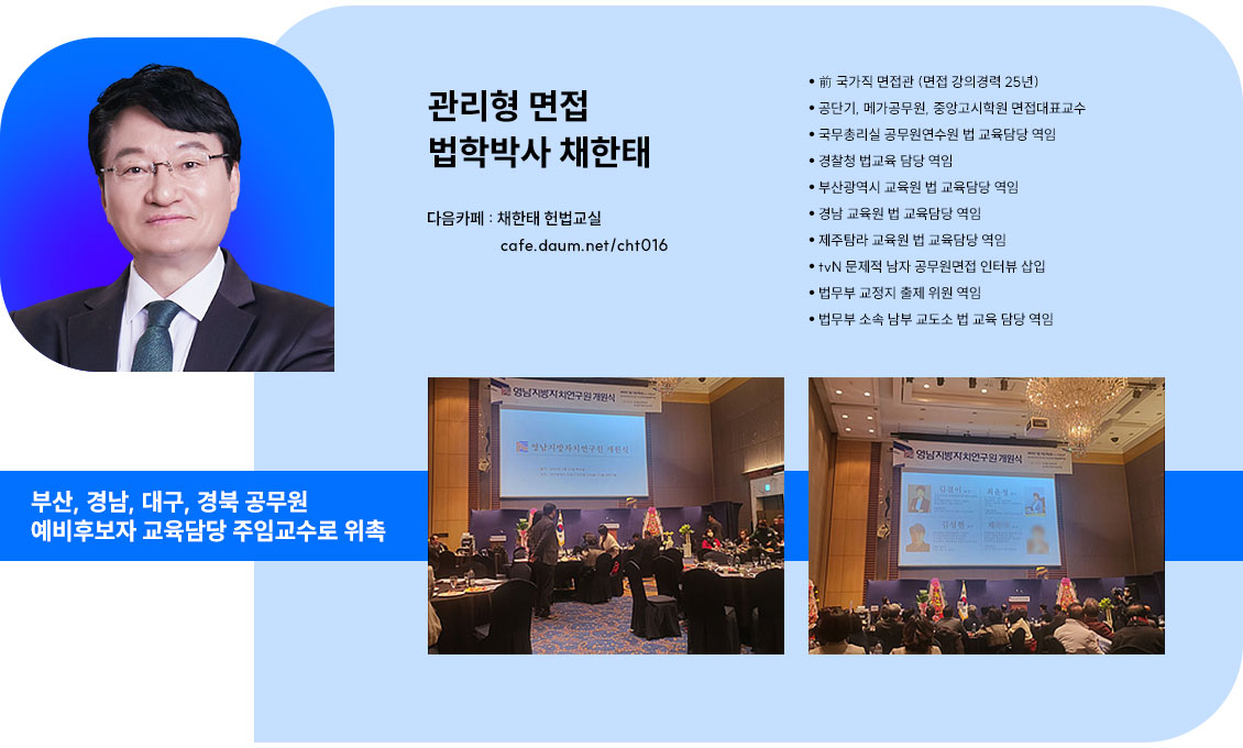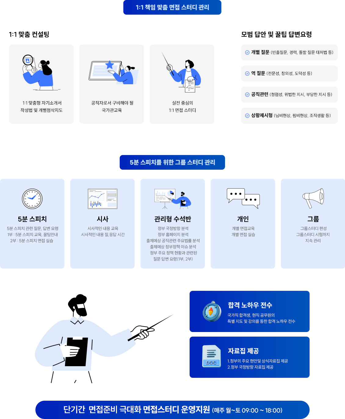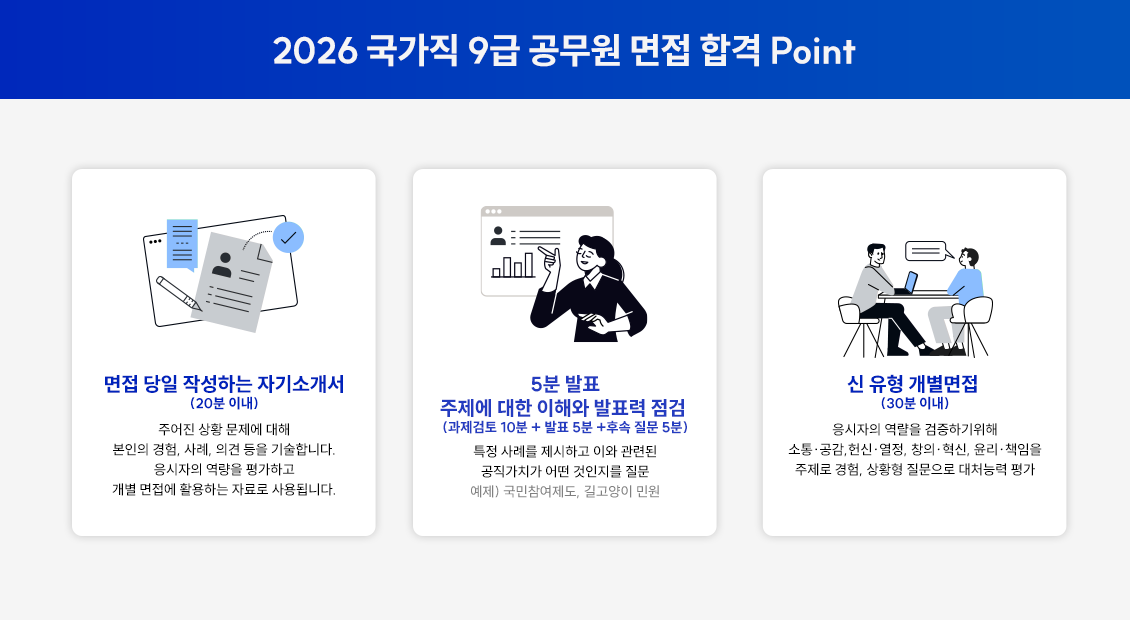 | DAY 1 (°³°) | 5/11(¿ù) | 14:00 ~ 18:00 | - ÀüüÀûÀÎ ¸éÁ¢ °³¿ä±³À° - °³º° Áú¹® ´äº¯ ¿ä·É 20°³ Ç׸ñ ±³À° - ±¹°¡°ü ±³À° - Àμº±³À° (Àλç¹ý, Ç¥Çö ¹æ¹ý) - ÃâÁ¦¿¹»ó ÁÖ¿ä Çö¾È Ű¿öµå ±³À° - ±¹°¡Á÷ ¸éÁ¢ ±âÃâ¹®Á¦ ºÐ¼® ¹× ¿¹»ó ÃâÁ¦¹æÇâ Á¦½Ã - ±¹°¡Á÷ ÇÕ°Ý ¼ö±â ¾È³» |